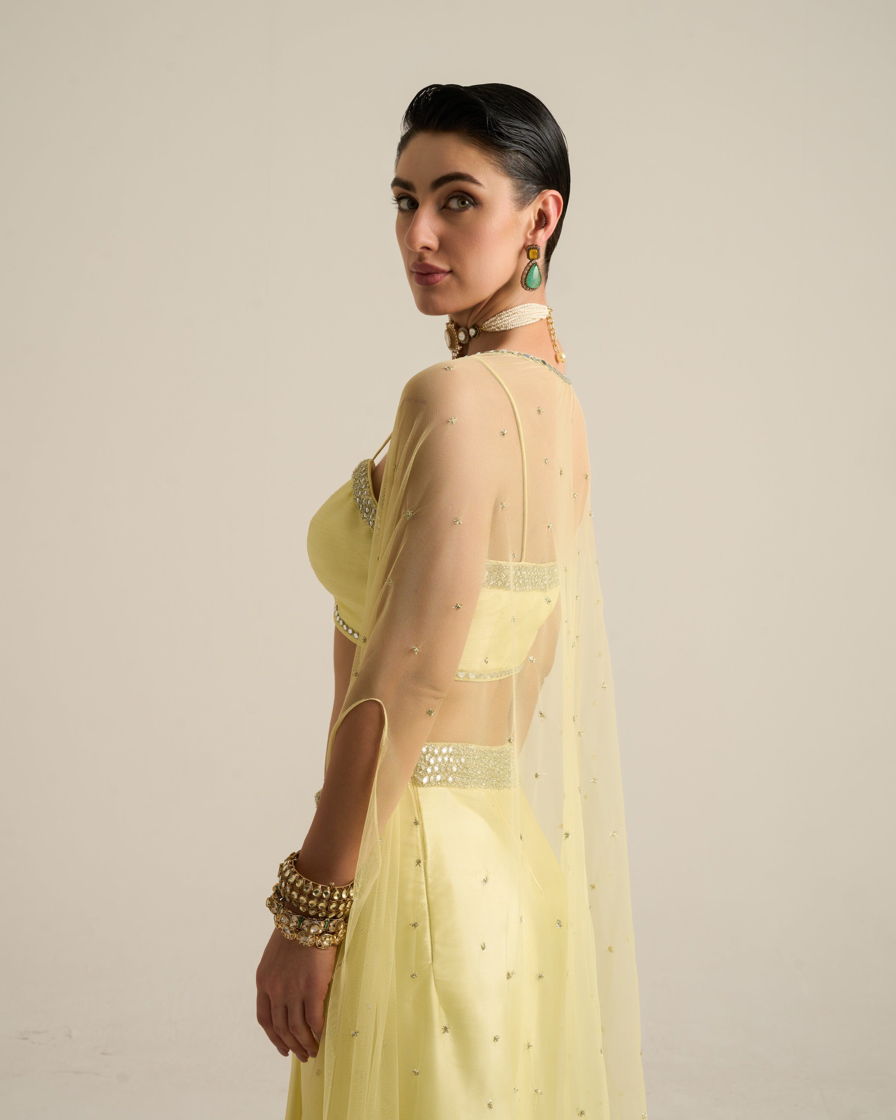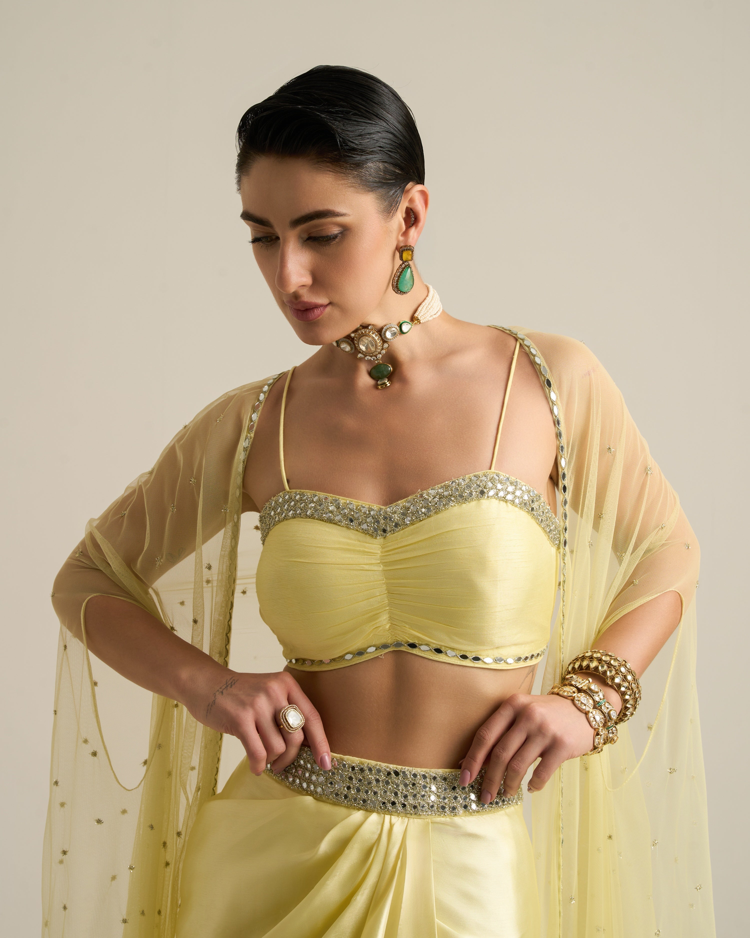 This radiant look features a soft lemon yellow draped skirt paired with a structured, embellished bustier blouse. The outfit is elevated by a sheer cape adorned with delicate sequin detailing, adding grace and fluidity. The mirror-work belt accentuates the waistline, creating a flattering and glamorous silhouette. Perfect for summer weddings or festive occasions with a modern twist.