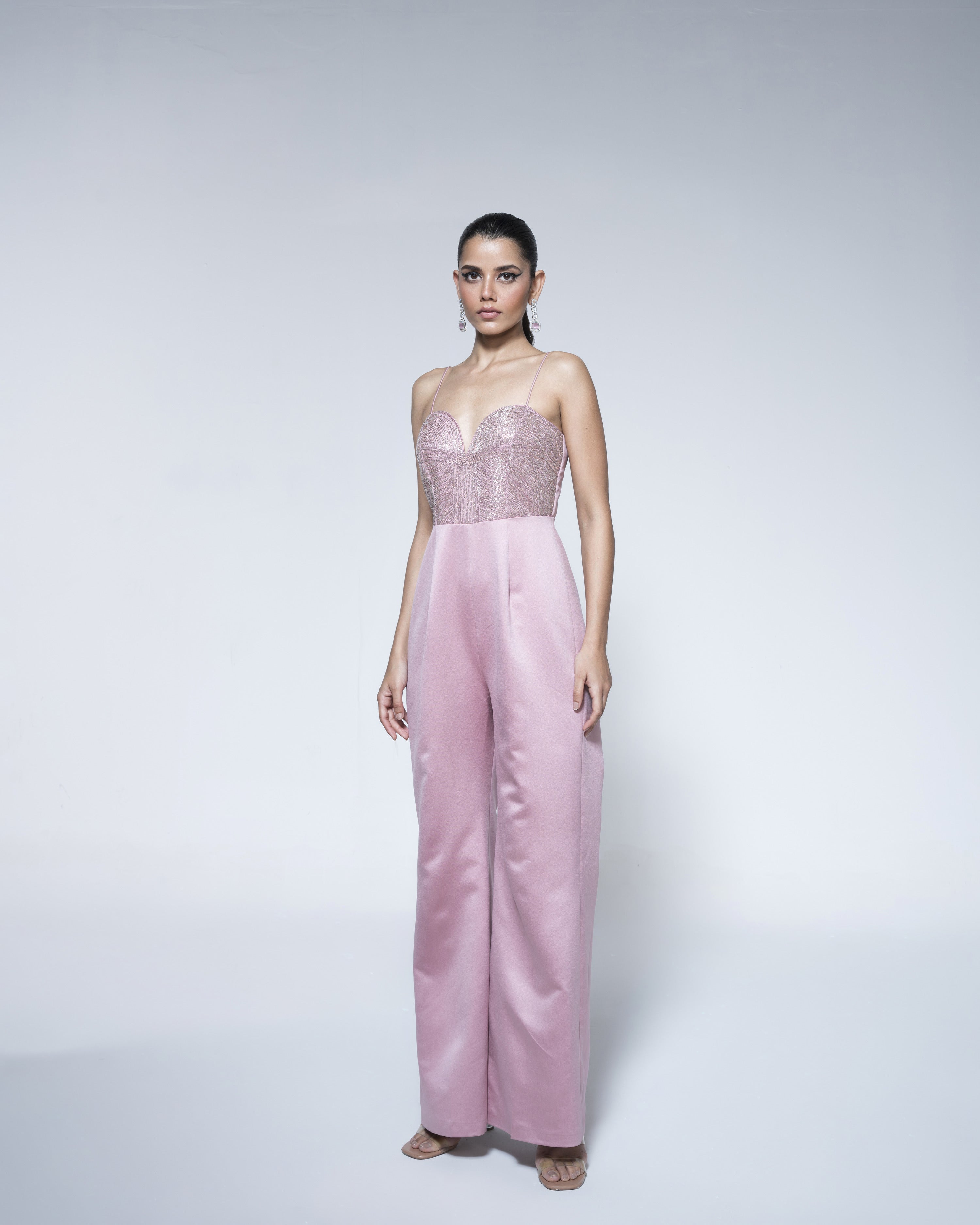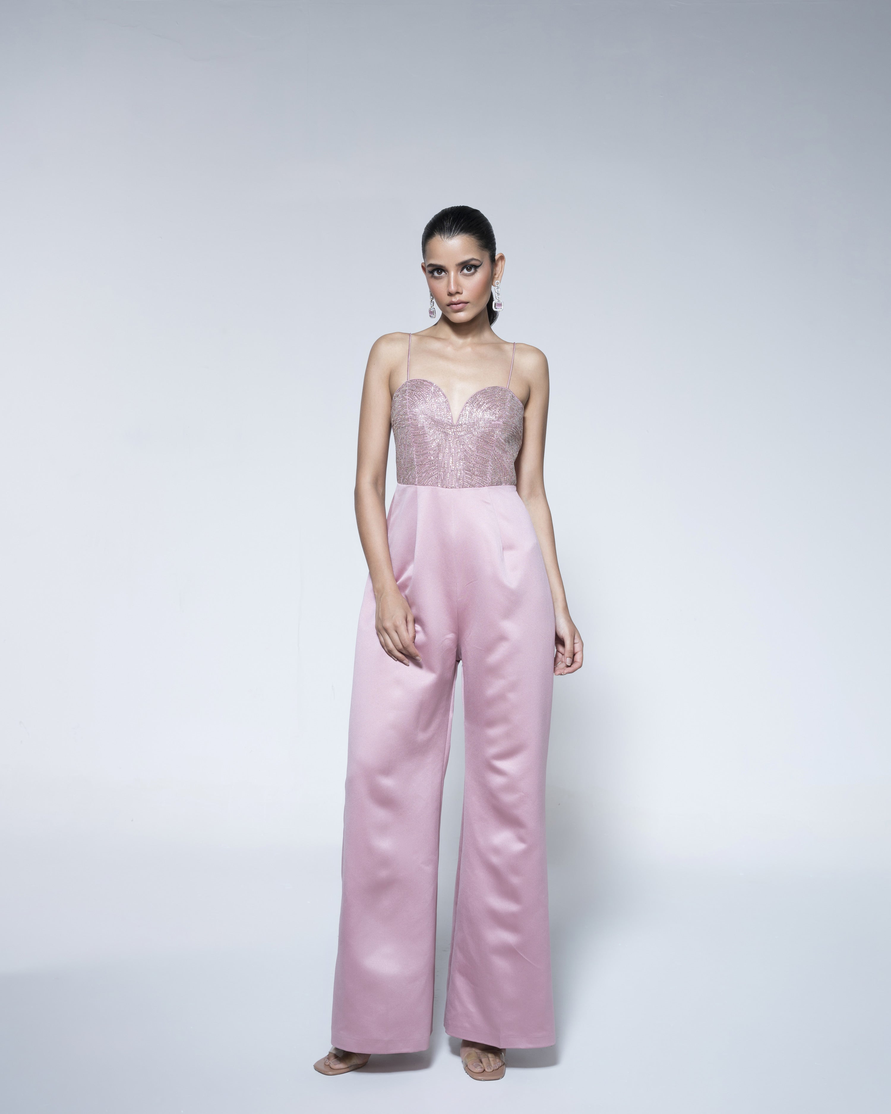Featuring a peach pink jumpsuit in dutchess satin base with centerhole, cutdana and sequins embellishment. Accentuate it with statement earrings and heels for a festive occasion or mehendi ceremony.