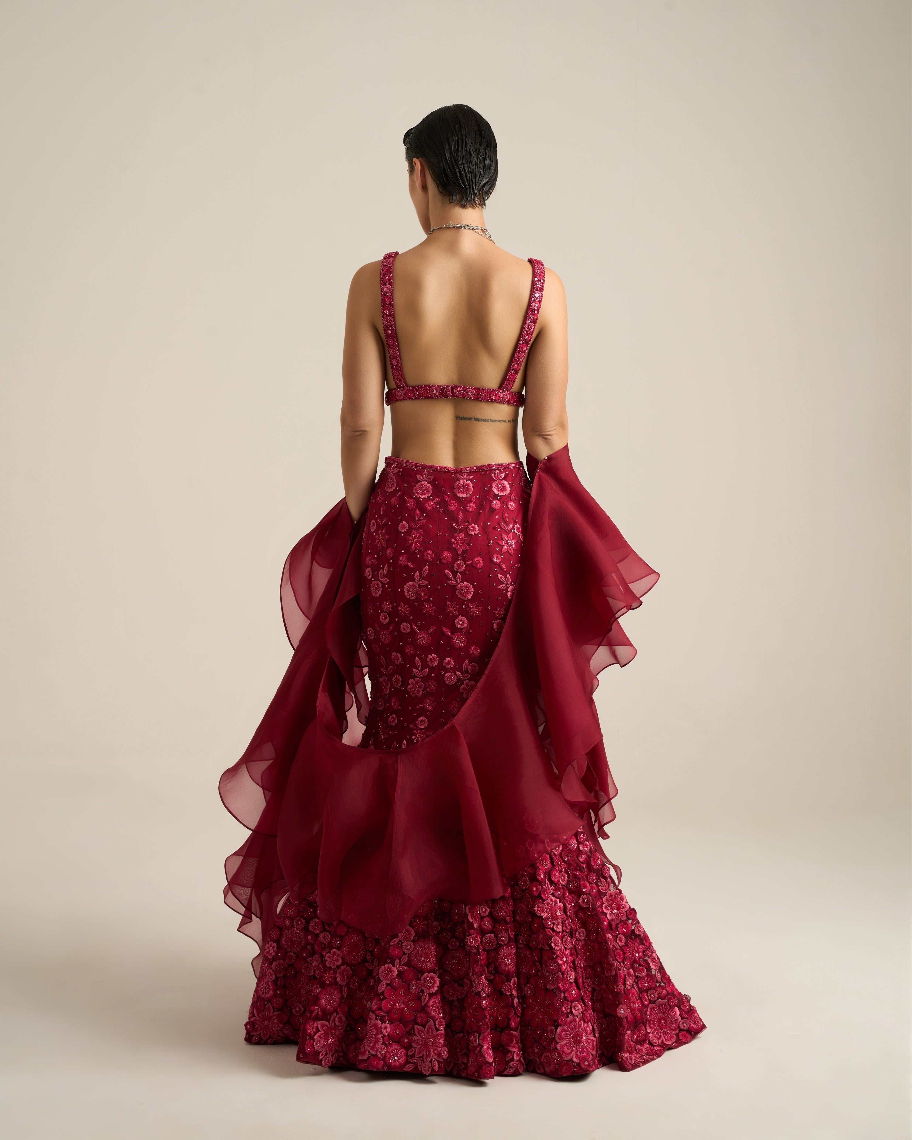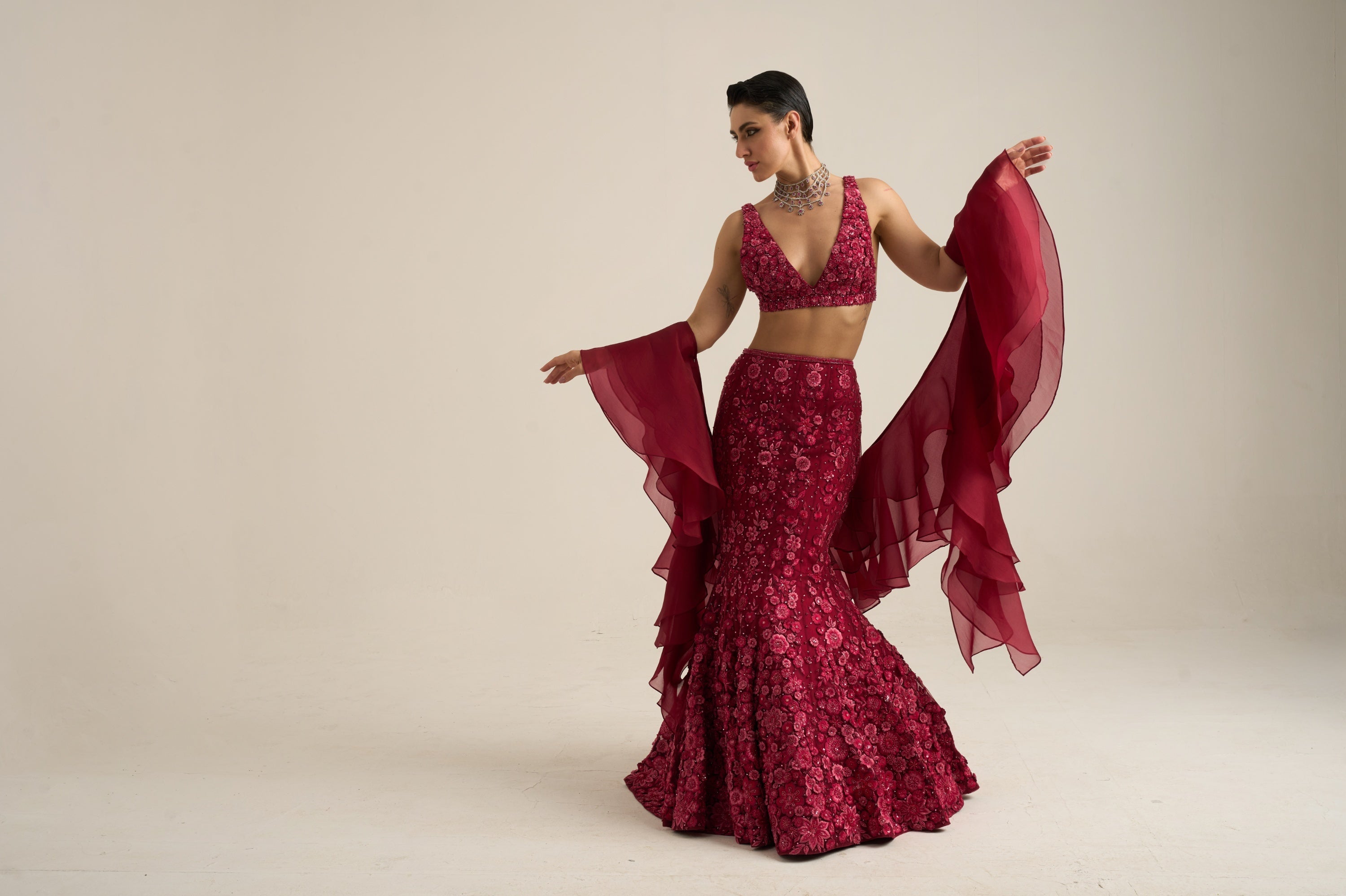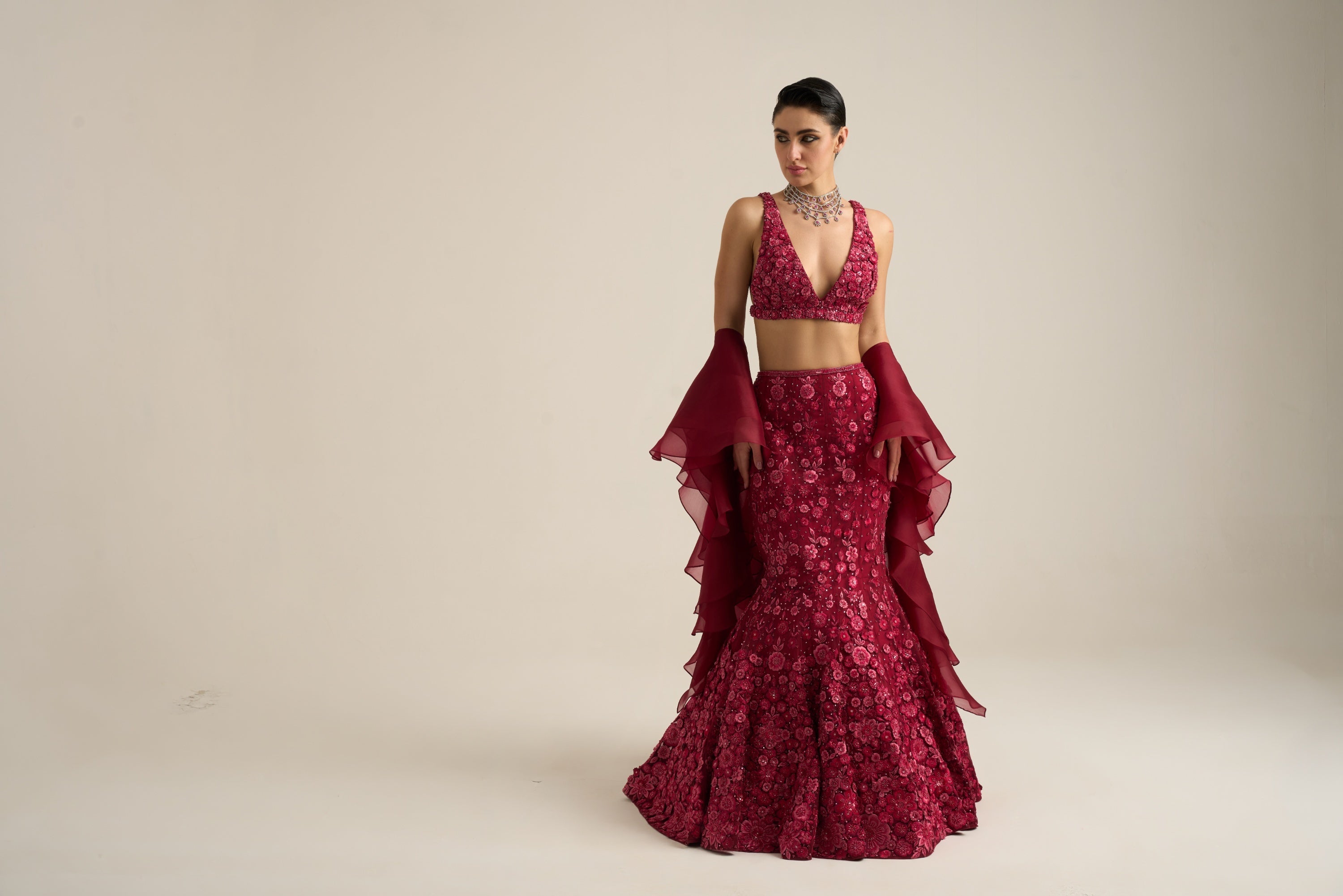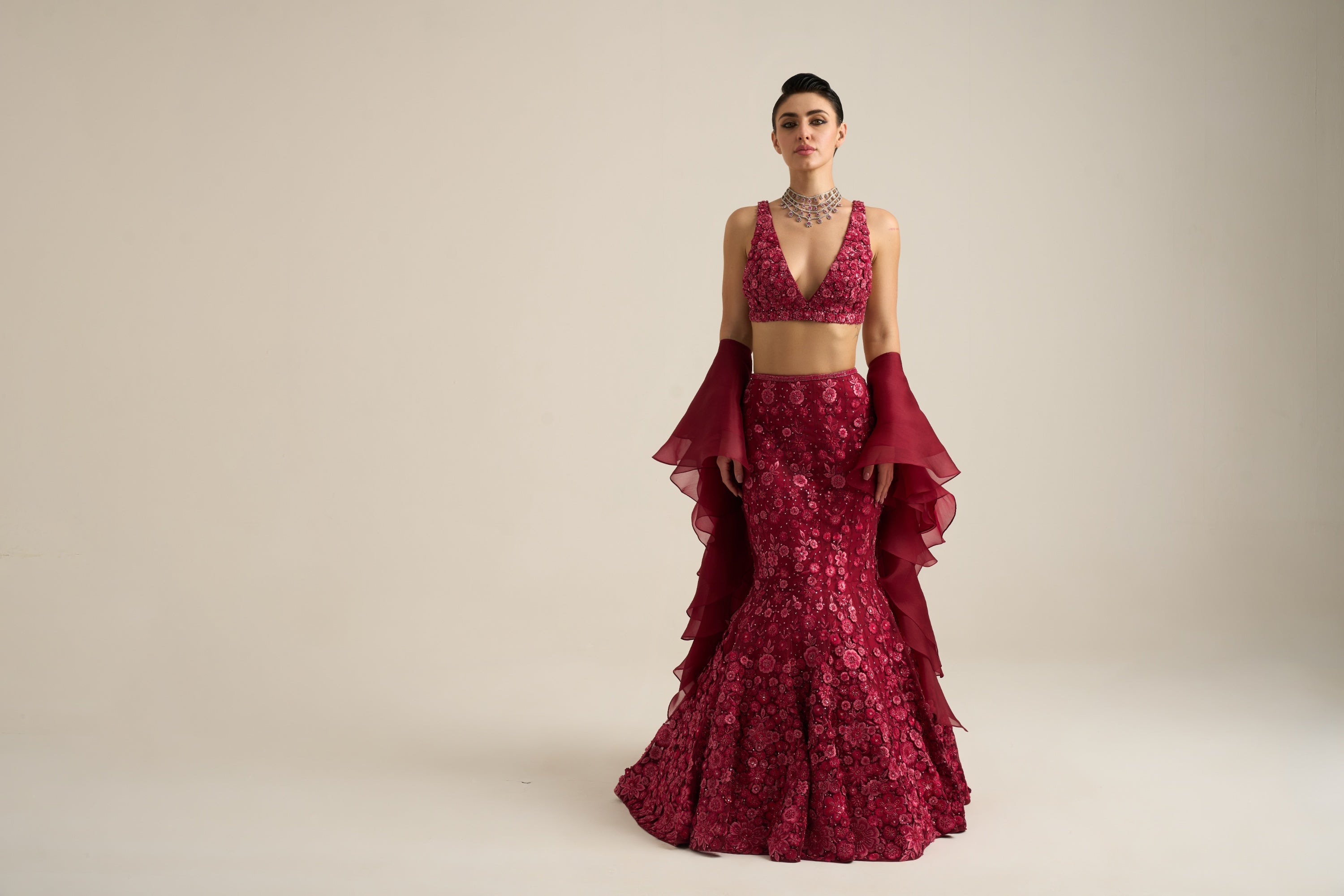 This glamorous ensemble is a rich wine-red lehenga set that exudes luxury and contemporary sophistication. The mermaid-cut skirt, intricately embroidered with tonal floral motifs, elegantly hugs the body before flaring out at the hem, adding drama and grace to the silhouette. The matching blouse features a daringly deep V-neckline, enhancing the outfit's modern appeal, while its structured cut ensures a flattering fit. Complementing the ensemble are sheer, cascading ruffle dupatta that drape from the arms like a cape, creating a sense of theatrical flair and movement.