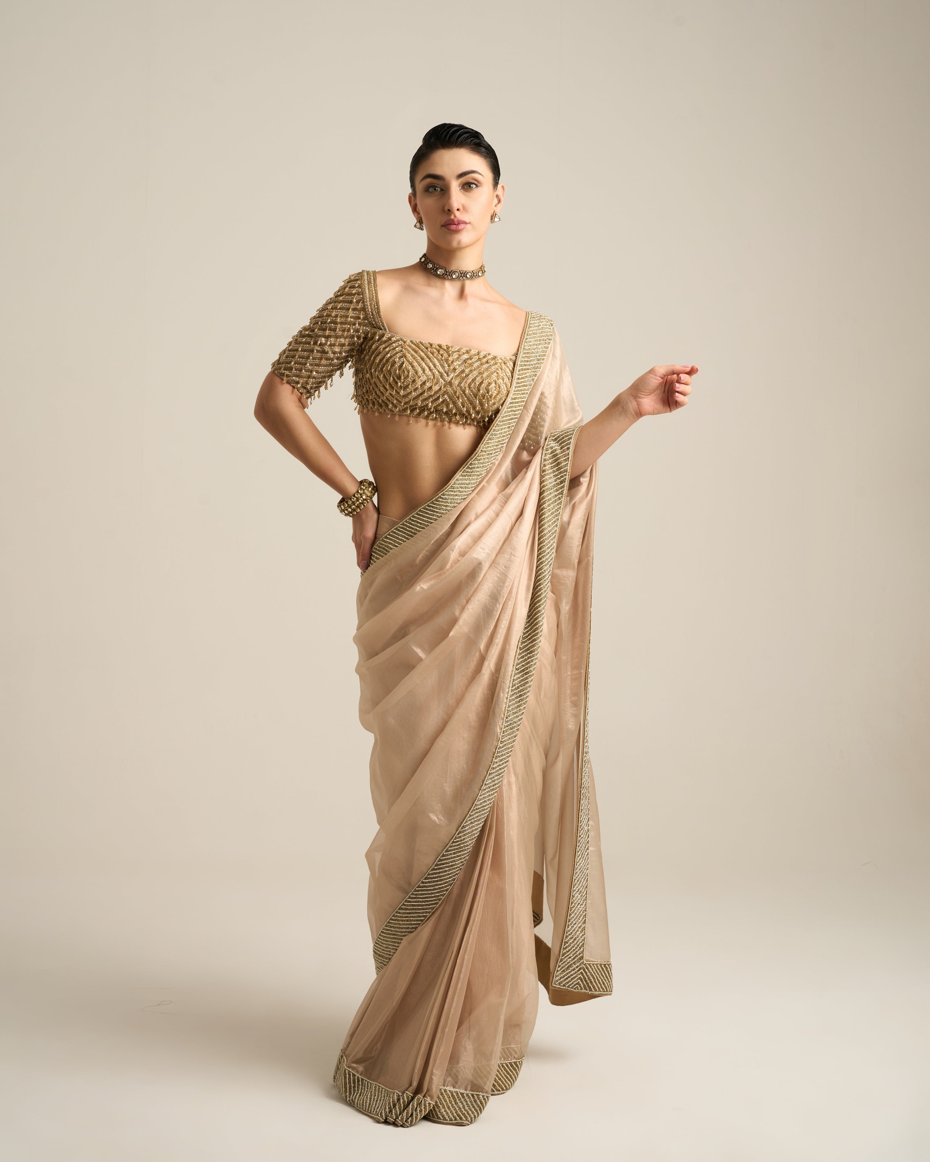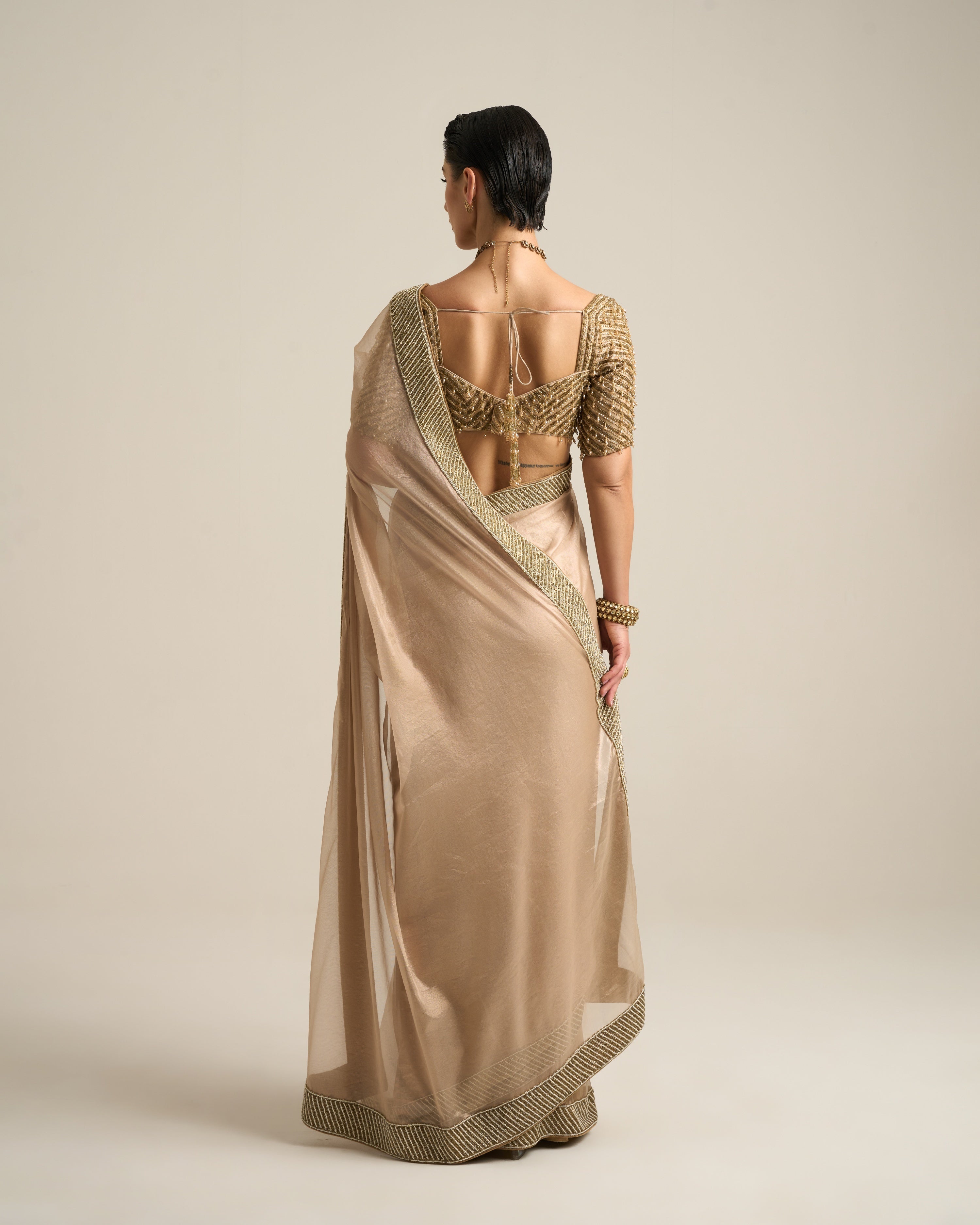 This look features a soft Gold saree with a shimmering textured border that adds refined elegance. It is paired with a statement blouse adorned with intricate hanging beadwork, creating a striking tactile effect and modern sophistication. The structured silhouette of the blouse contrasts beautifully with the fluidity of the saree, making it perfect for glamorous evening affairs or festive celebrations.