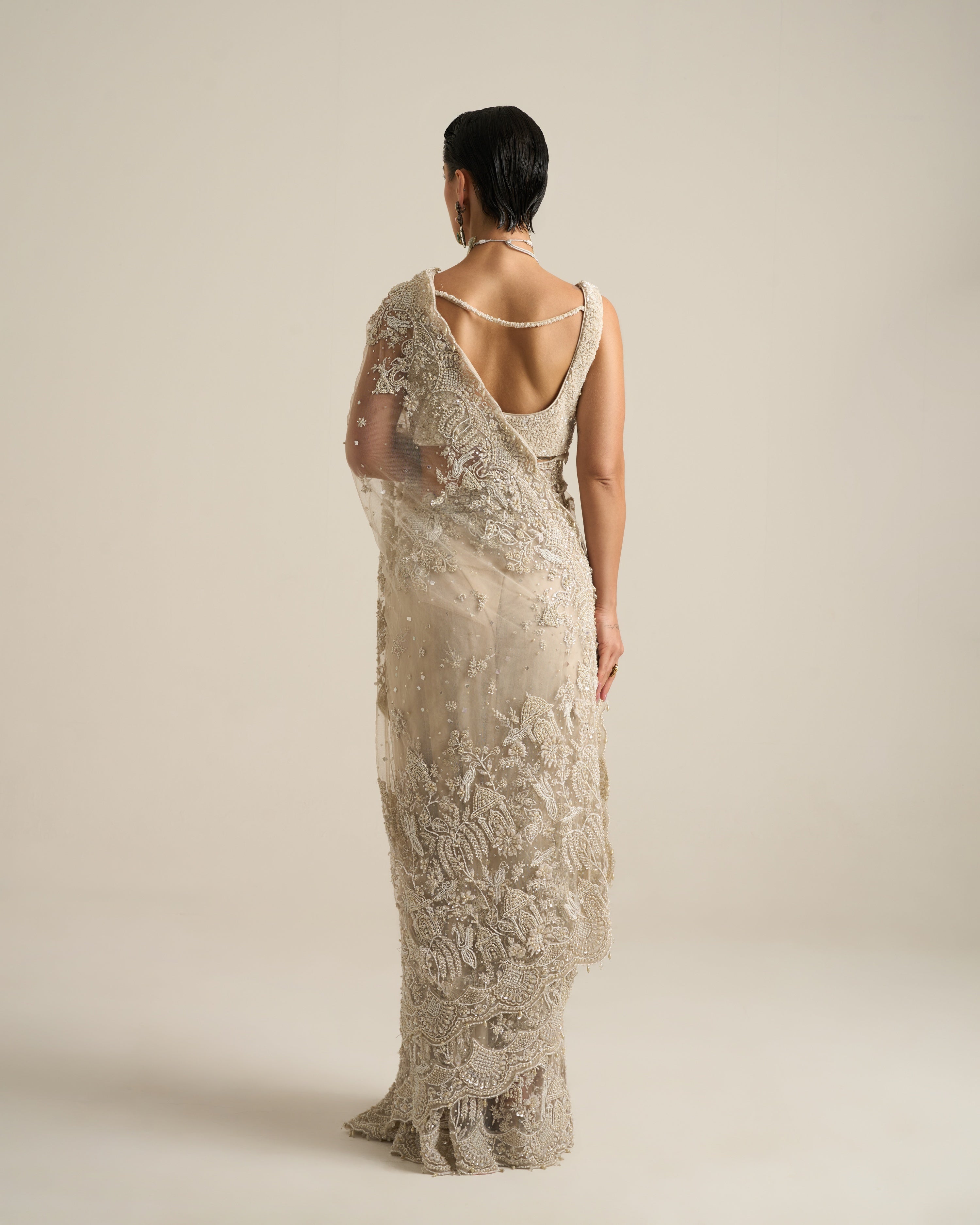 This exquisite ivory saree is a celebration of timeless elegance, featuring intricate embroidery and delicate sequin work throughout the drape. The saree is paired with a sleeveless, deep sweetheart blouse adorned in matching embellishments, adding a refined charm. The soft, sheer fabric creates a graceful silhouette, ideal for weddings, receptions, or formal events.