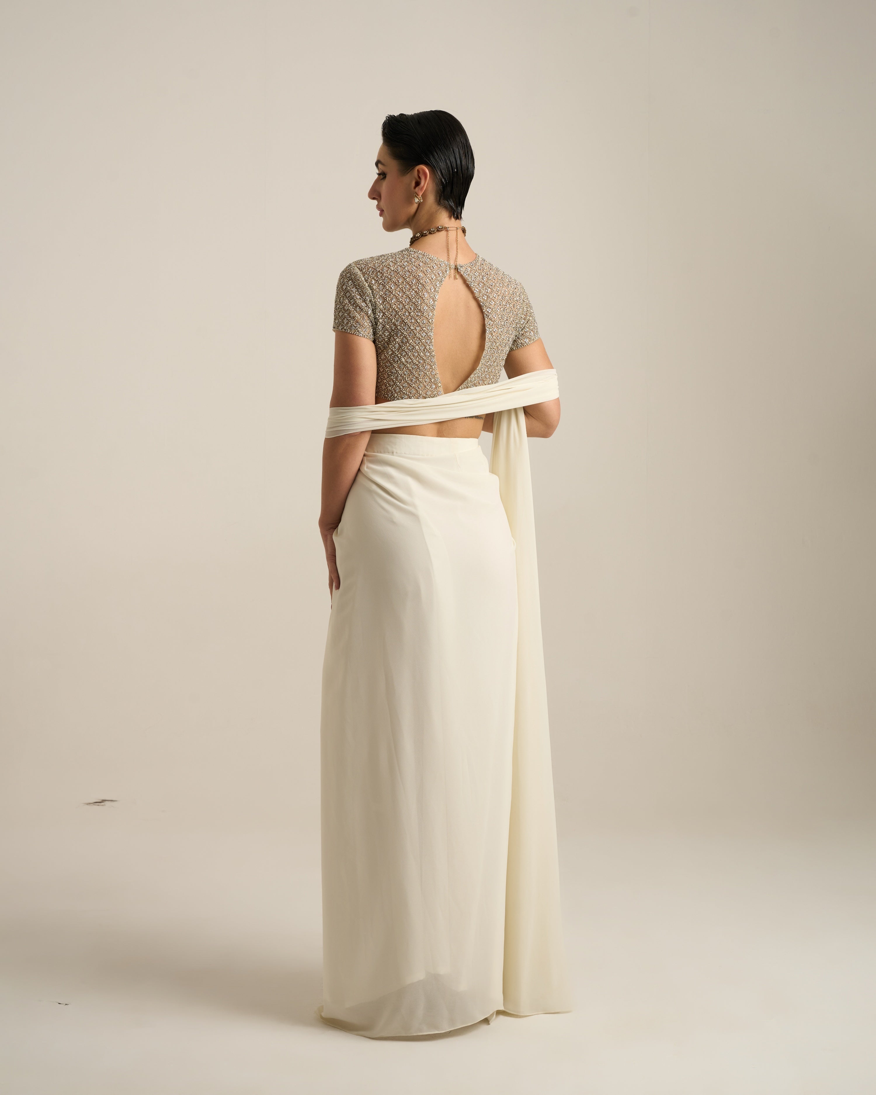 An elegant ivory saree in soft, fluid fabric, styled with structured pleats and a clean drape for a modern silhouette. Paired with a high-neck, short-sleeved blouse featuring delicate metallic embroidery that adds texture and depth. The minimal palette is elevated by the rich craftsmanship of the blouse, creating a refined, contemporary ensemble ideal for chic daytime events or refined soirées.