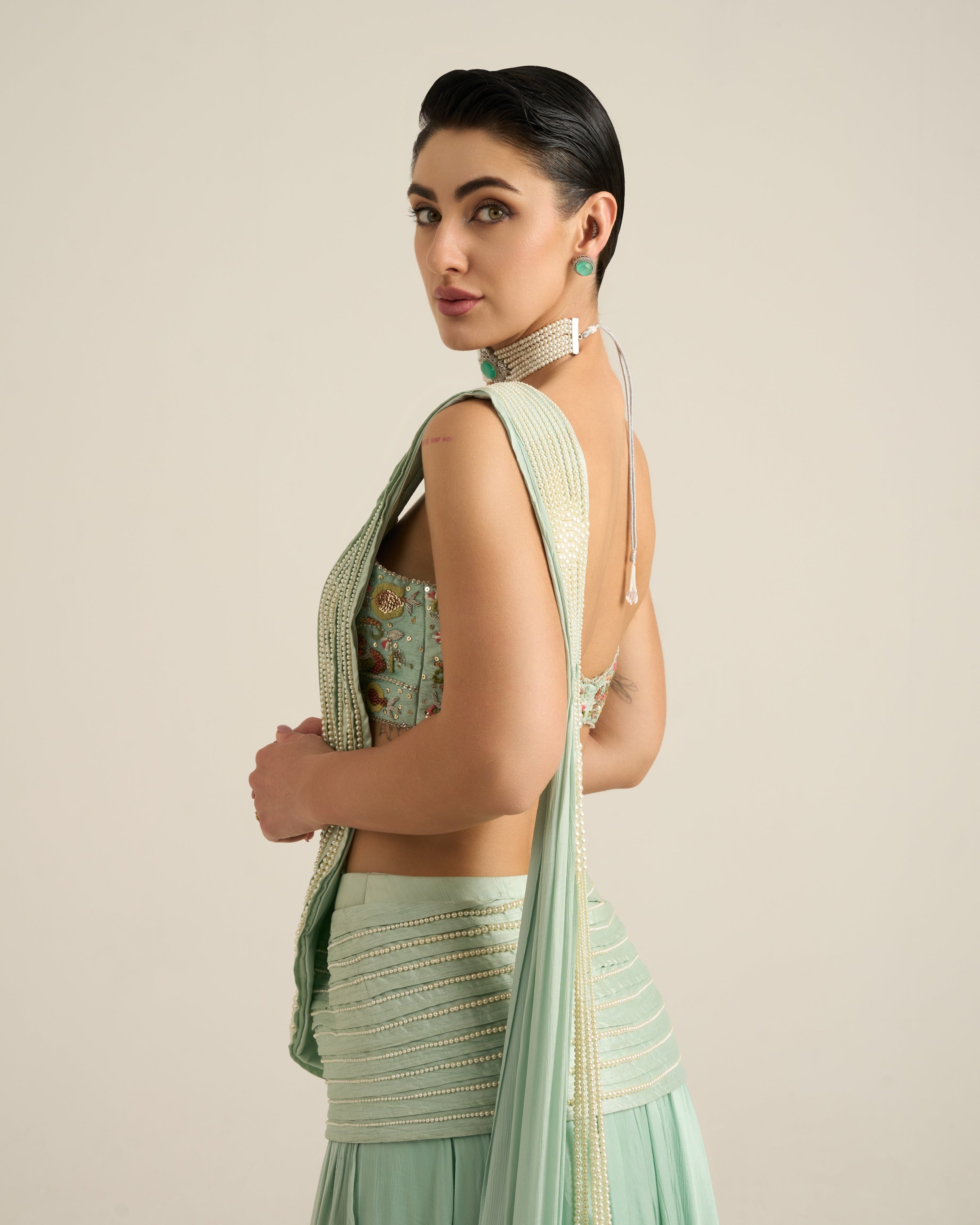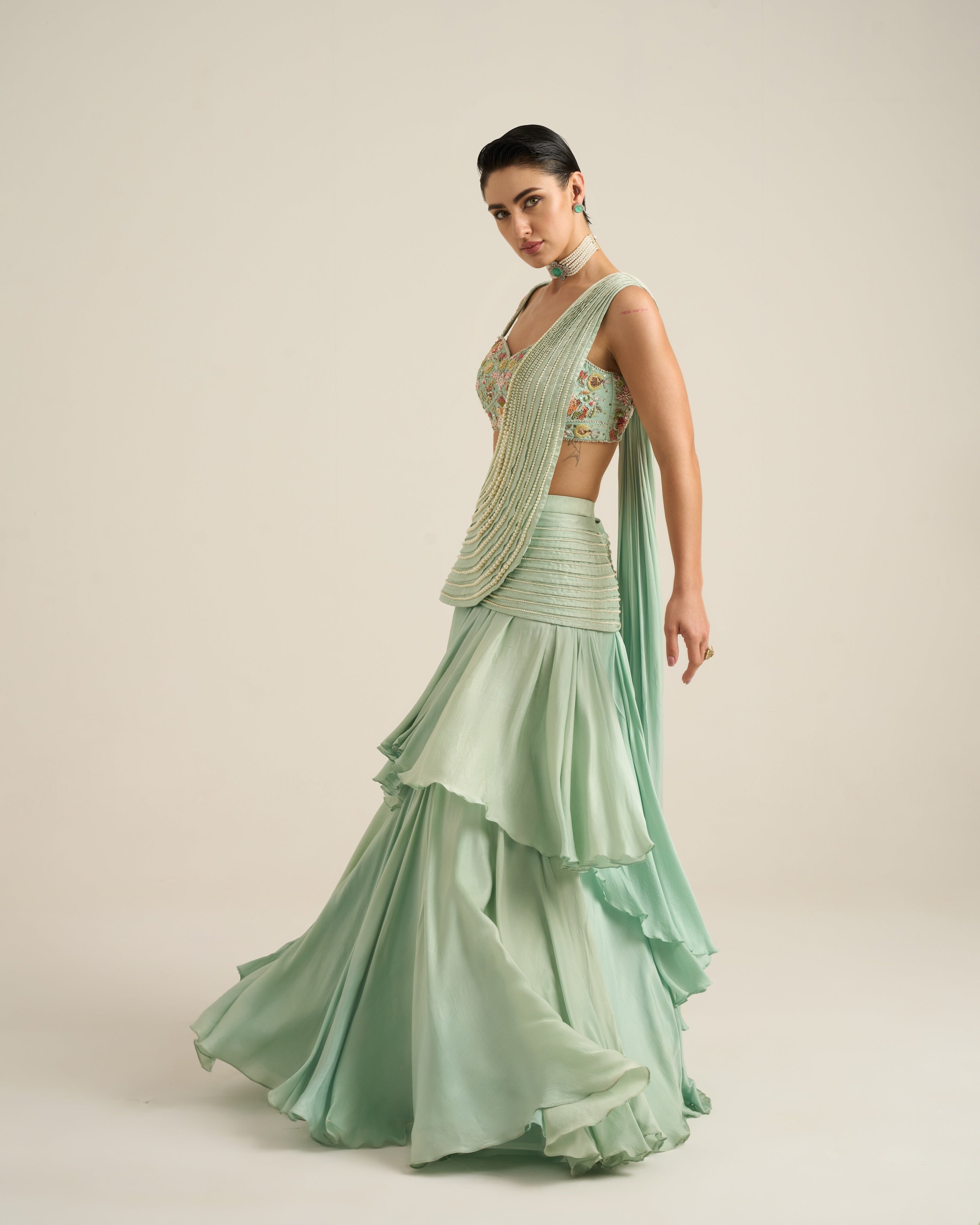 A striking two-layer circular skirt-style drape saree that combines elegance with contemporary flair. The attached western-inspired pallu/dupatta is enhanced with long, graceful bead tassels that add movement and charm. Paired with a sleeveless blouse, beautifully embroidered with intricate floral details, this ensemble offers a perfect blend of traditional draping and modern style. The voluminous skirt adds drama, while the unique design ensures you stand out at any special occasion.