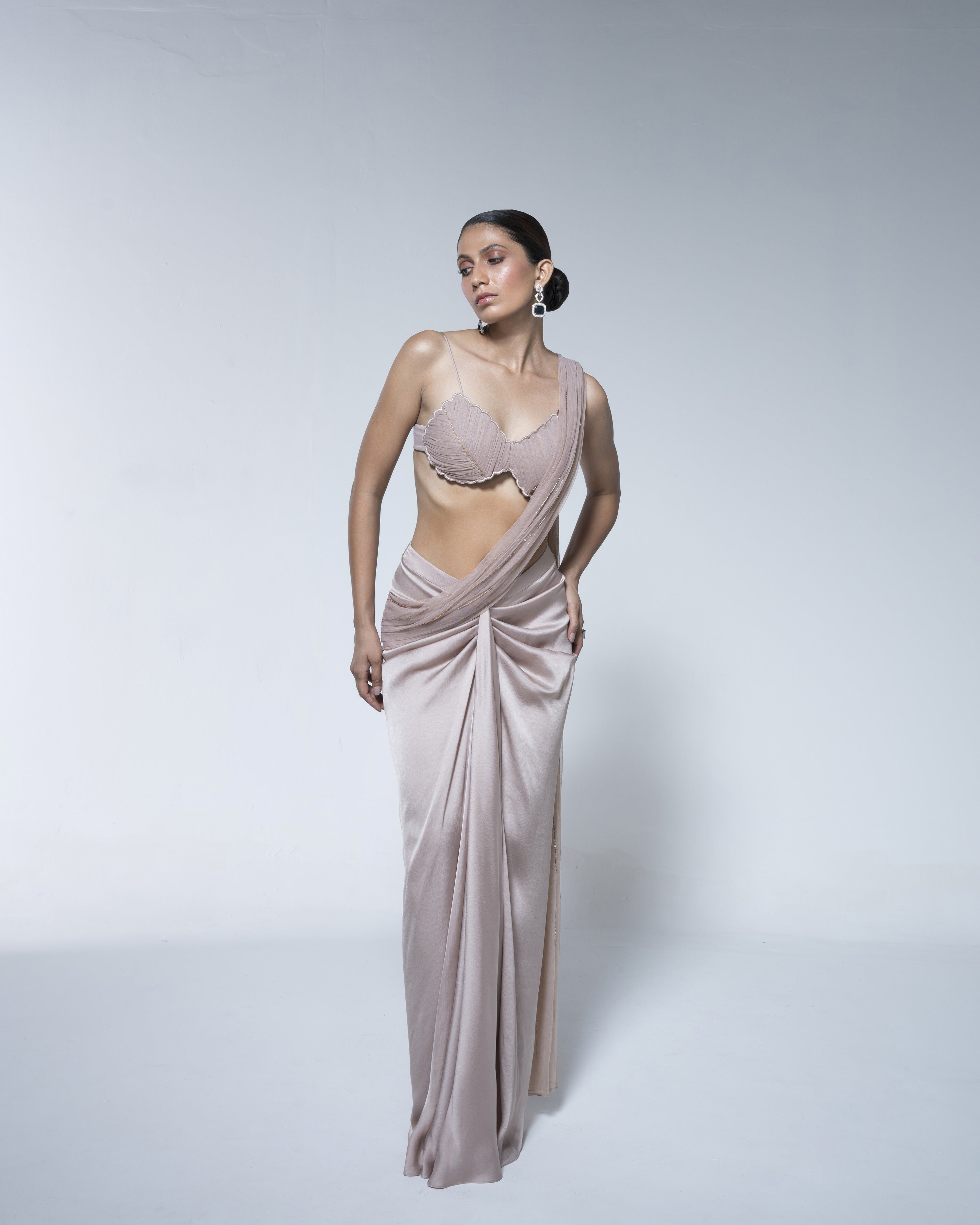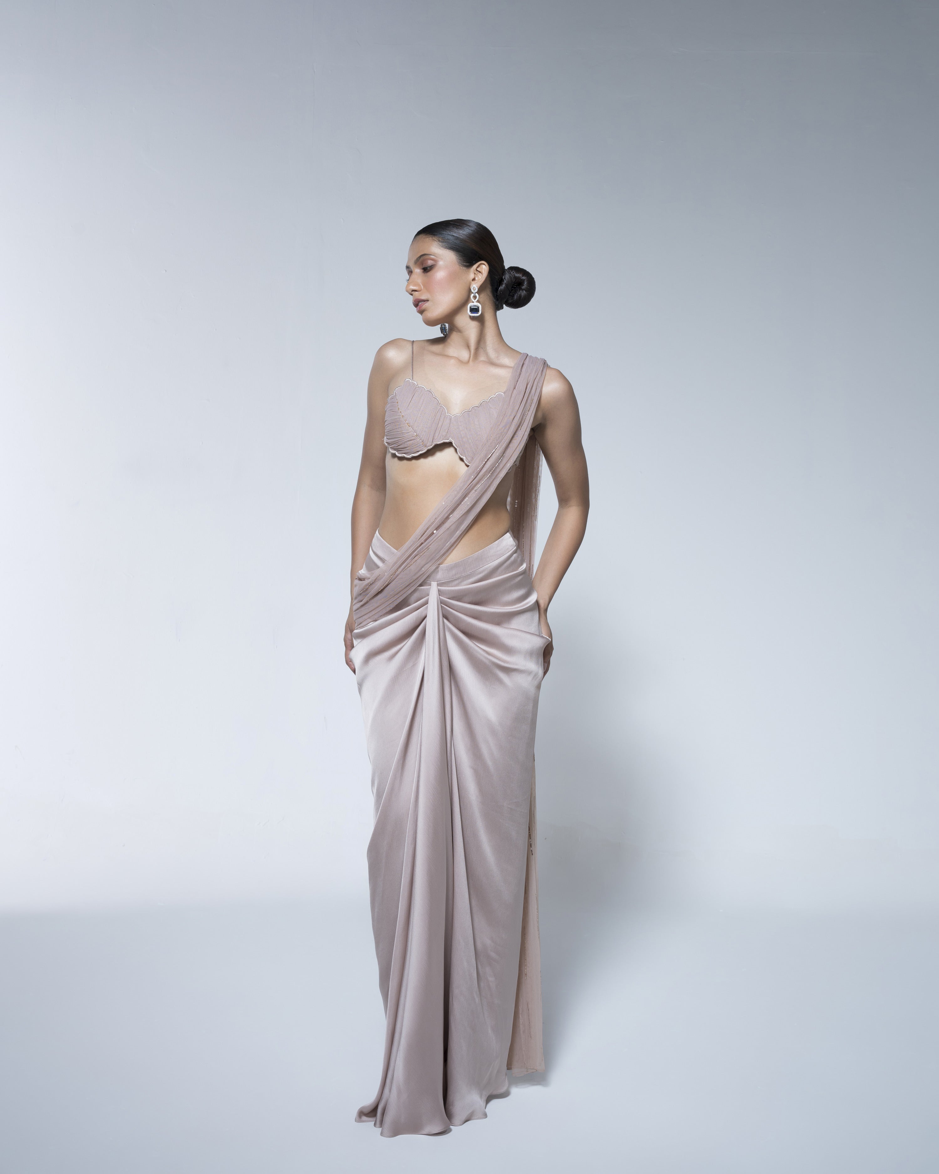 Featuring a champagne draped saree in satin chiffon base with embriodered net pallu . It is paired with a uneven flap embriodered blouse. Accentuate it with statement jewellery and heels for a wedding or sangeet ceremony.