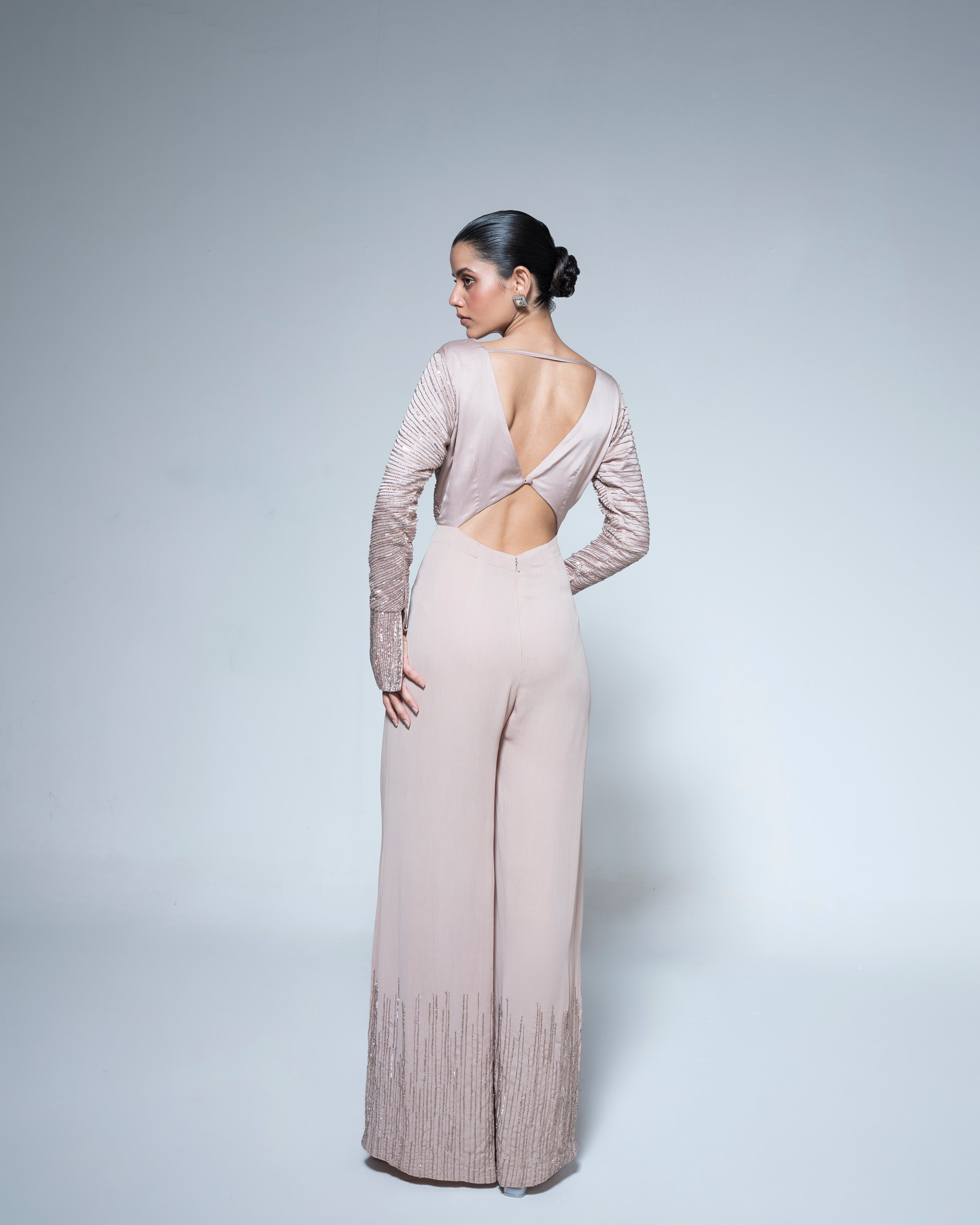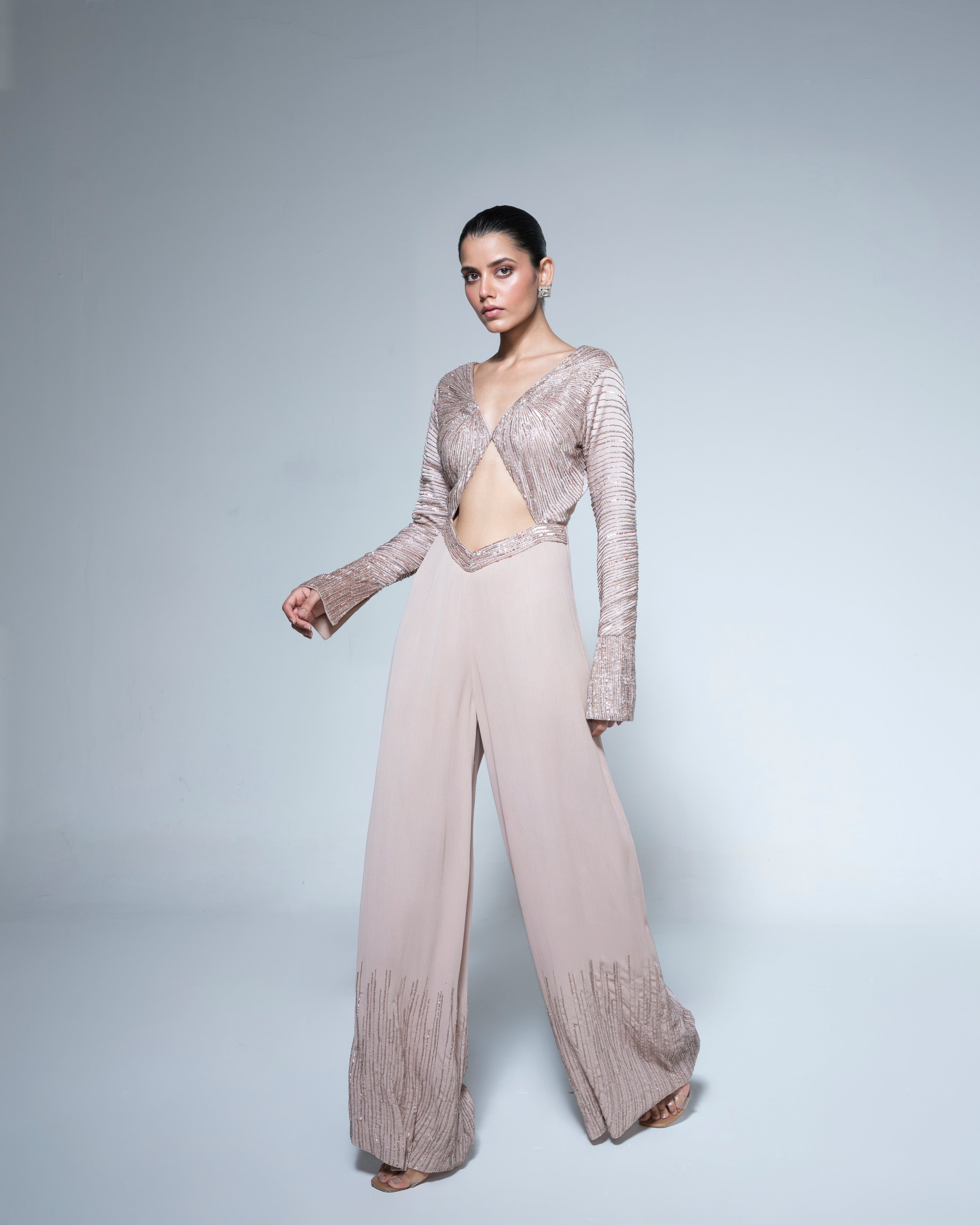 Featuring a champange jumpsuit in banana crepe base with centerhole, cutdana and sequins embellishment. Accentuate it with statement earrings and heels for a festive occasion or mehendi ceremony.