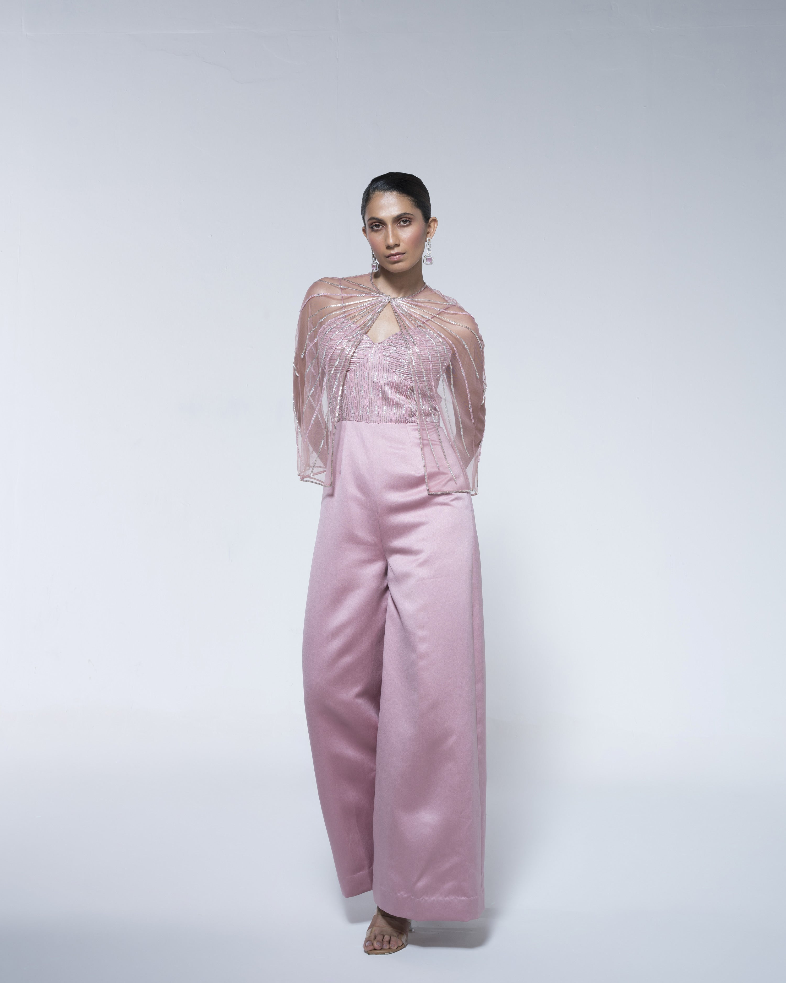 Featuring a peach pink jumpsuit in double georgette base with centerhole, cutdana and sequins embellishment. It is paired with hand embriodered net cape giving geometric detailing. Accentuate it with statement earrings and heels for a festive occasion or mehendi ceremony.