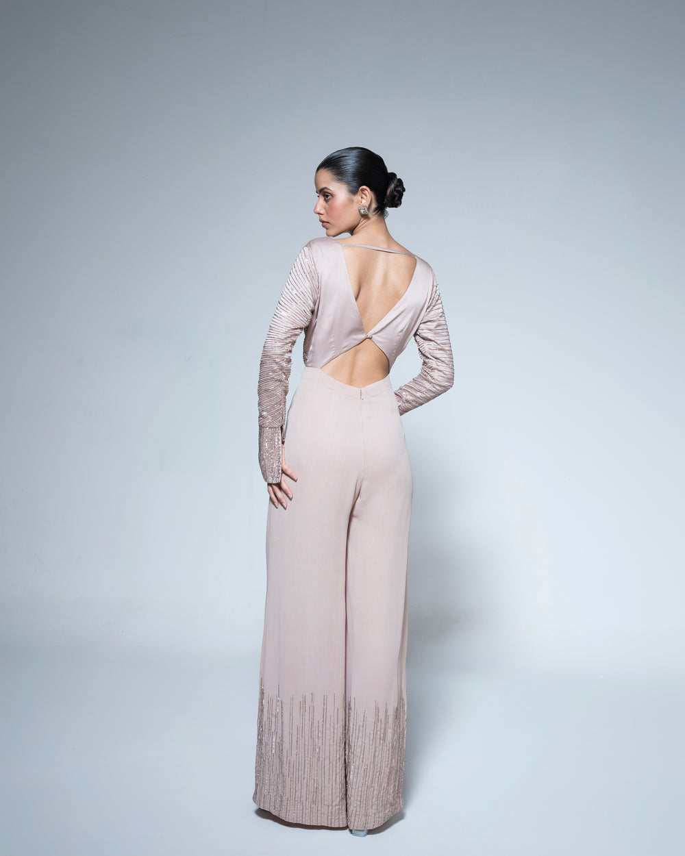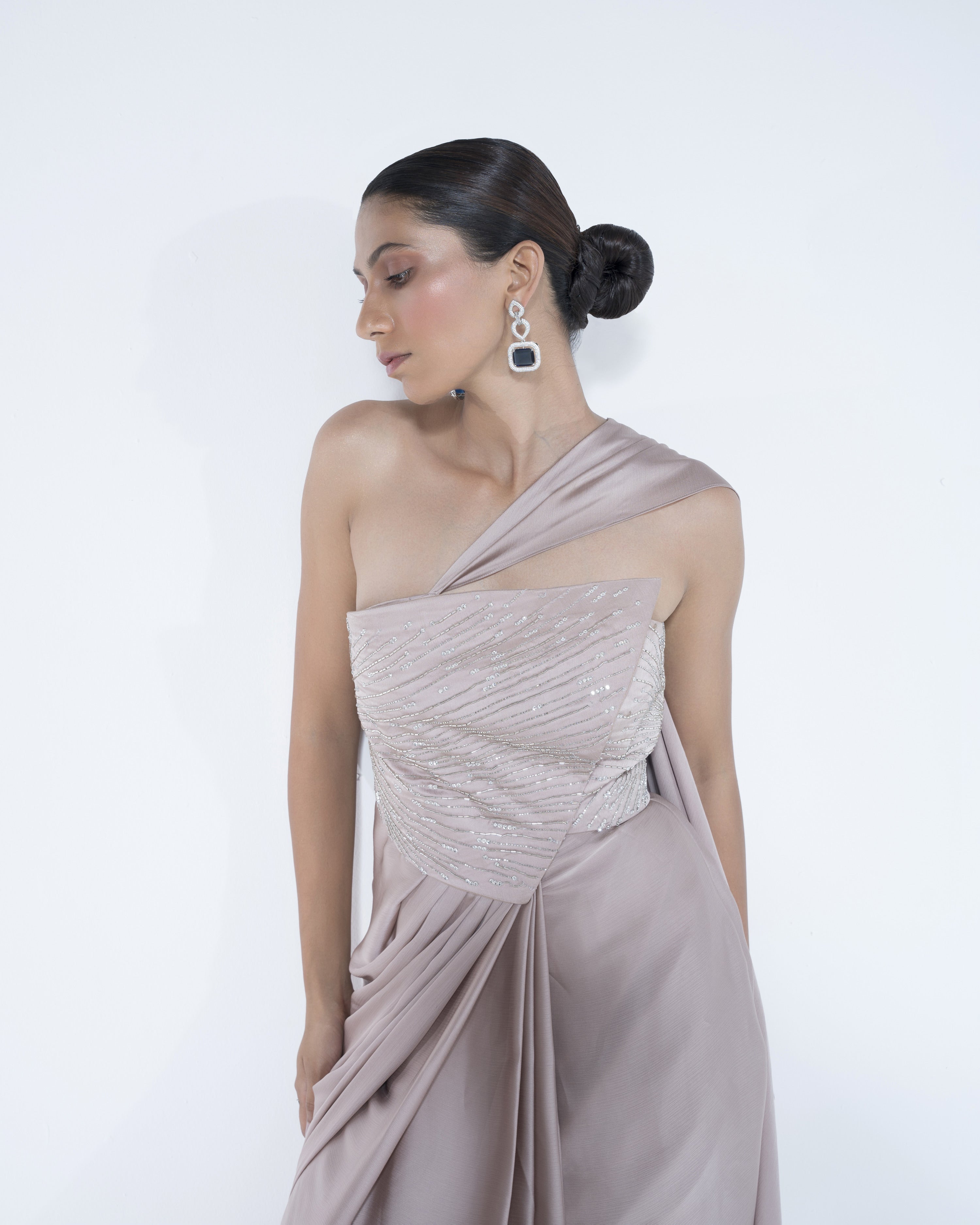 Pre Draped Champagne Saree With Wrap Around Blouse Detail