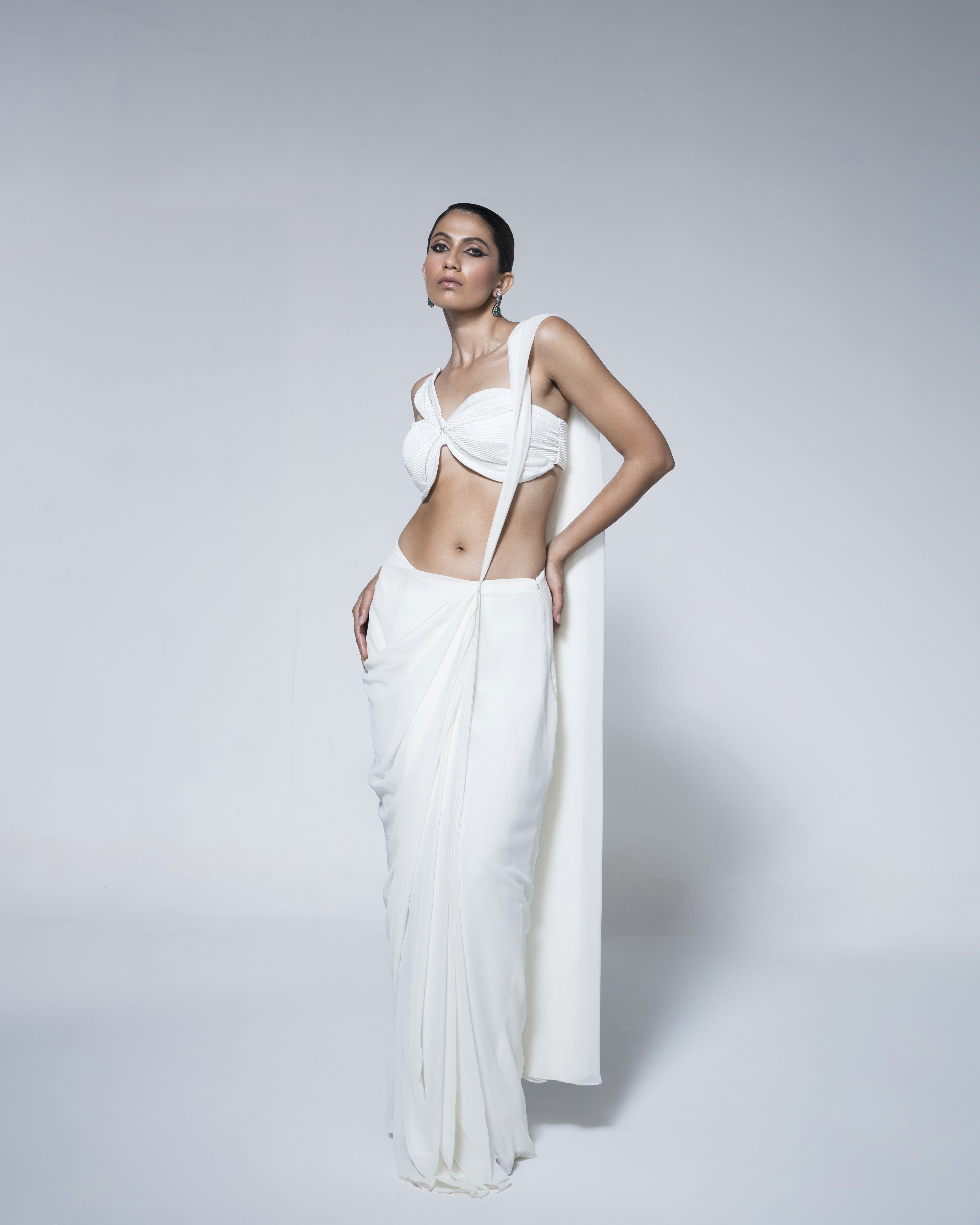 A mesmerizing Ivory Draped Saree Set that captivates with its elegance. The eye-catching saree is crafted in Double Georgette withvery sleek pallu . It is paired with an embroidered concept blouse. Accessorize the designer saree set with statement earrings and heels for weddings or sangeet ceremonies, showcasing style and sophistication.
